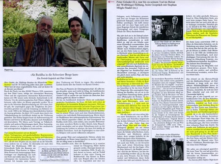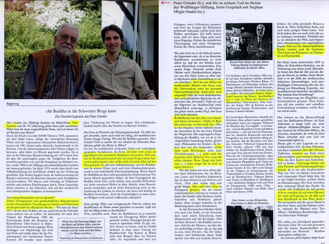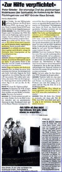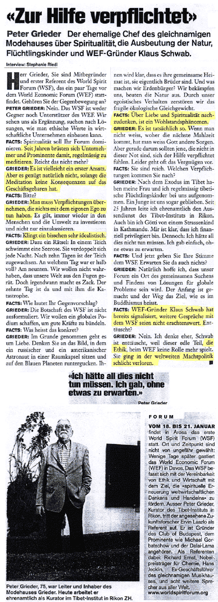 "Wie Buddha in die Schweizer Berge kam" Ein Inter-view-Gespräch zwischen Peter Grieder und Stephan Mögle-Stadel teilweise abgedruckt in der Zeitschrift Goetheanum und in dem Buch "Menschheit an der Schwelle" ![]() ![]() "Zur Hilfe verpflichtet" erschienen in Zeitschrift Facts, Ausgabe 3/2004 -- Peter Grieder der ehemalige Chef des gleichnamigen Modehauses über Spiritualität, die Ausbeutung der Natur, Flüchtlingskinder und WEF-Gründer Klaus Schwab. Peter Grieder ist Beiratsmitglied der Weltbürgerbewegung (WFM Germany e.V.) |