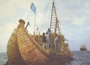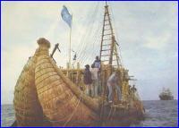 Der Aussteiger beendete nach einem Jahr seinen Inselaufenthalt und das Manuskript seines ersten Buches >Fatu Hiva - Zurück zur Natur<. Dieser zufällige Fund war der erste Stein für die mittlerweilen bestätigte Hypothese, daß Polynesien nicht von Asien, sondern von einer Vor-Inka-Kultur Südamerikas aus besiedelt wurde. Heyerdahl forschte weiter und puzzelte, neben anderen Indizien wie die Gleichheit mathematischer Systeme und Schädeloperationstechniken, die Pyramiden in Meso-potamien, Ägypten, auf Malta und den Kanaren mit den Pyramiden in Mittel- und Südamerika zusammen. Das Ergebnis wies auf einen regen Schiffsverkehr in den, der modernen Geschichtswissenschaft noch weitgehend unbekannten Anfängen der frühsten Hochkulturen hin. Um seinen lachenden Professoren zu beweisen, daß ein solcher Schiffsverkehr selbst mit den einfachsten Fahrzeugen möglich sei, wenn die Meeresströmungen als verbindende "Motorik" genutzt werden, unternahm er mehrere Seereisen. Von dem südpazifischen Mendana-Meeresstrom und günstigen Winden ließ sich der Nachfahre der Wikinger 1947 mit seinem Balsaholzfloß "Kon-Tiki" vom peru-anischen Hafen Callao aus nach Tahiti treiben.Thor Heyerdahl, Schilfboot und UNO-Flagge Im Mai 1969 und 1970 startete er unter dem Segelzeichen des alt-ägyptischen Sonnengottes Ra mit den Papyrusbooten "Ra I" und "Ra II" von Gibraltar aus, über die Kanarischen Inseln, zu seinen damals spektakulären Atlantiküberquerungen.