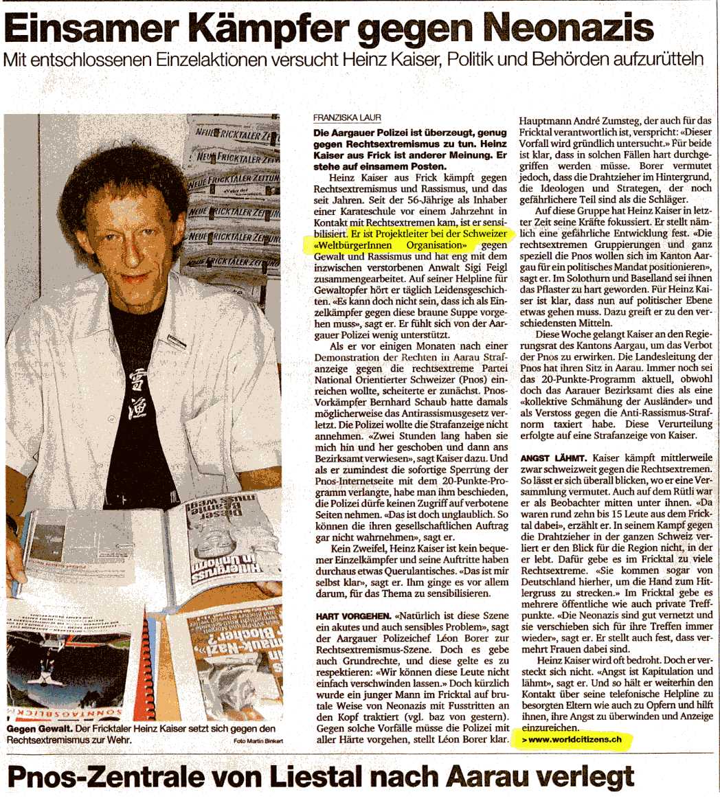 Heinz Kaiser ist Vorstandsmitglied der Schweizer Weltbürger. Er lebt sein kosmopolitisches Engagement couragiert als Projektleiter gegen Rassismus und Neonazitum.