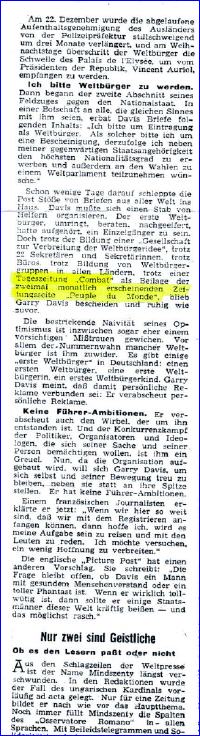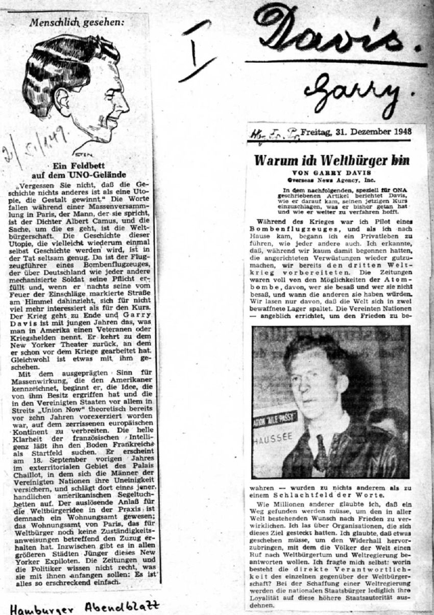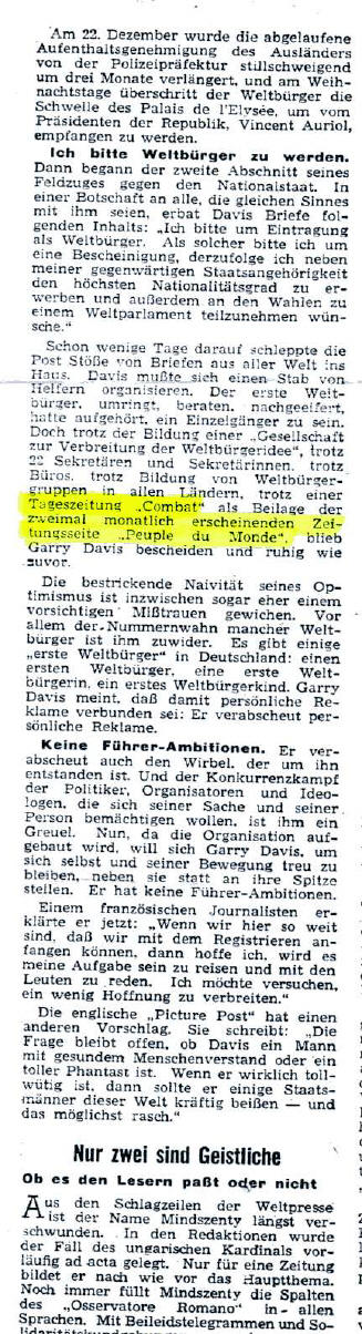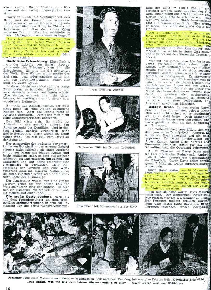 Ein wenig Hoffnung - Weltbürger Garry Davis![]() Spiegel-Ausgabe vom 02. 04. 1949 (Nr. 14) Titelseite mit Garry Davis, Robert Sarrazac, Albert Camus und anderen Weltbürgern beim Verteilen von Flugblättern vor dem UNO-Gebäude anläßlich der Besetzung durch die Weltbürgerinitiative. Spiegel-Ausgabe vom 02. 04. 1949 (Nr. 14) Text 1 ![]() |