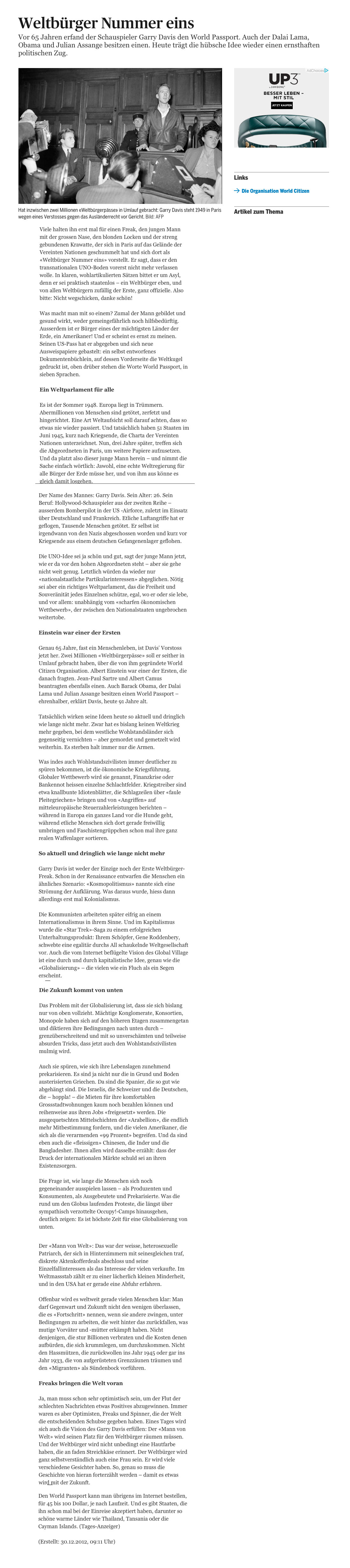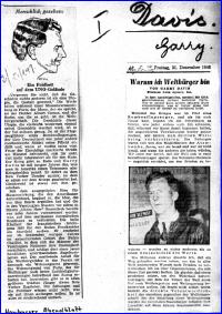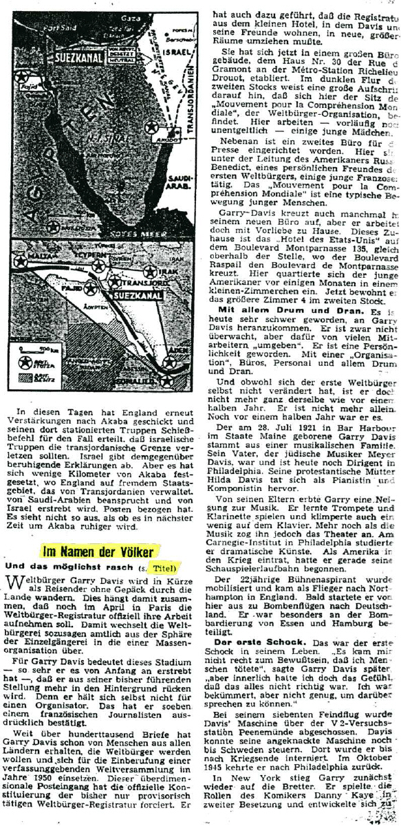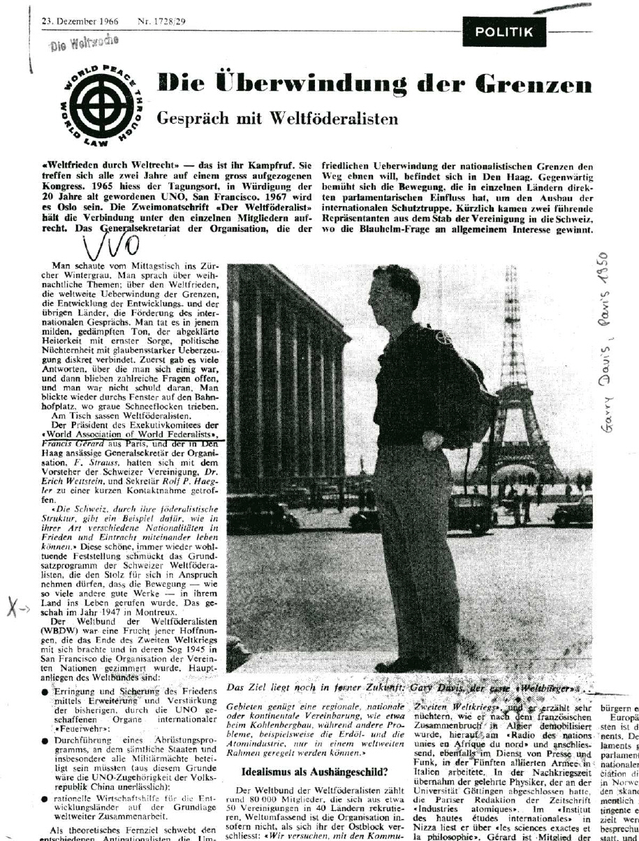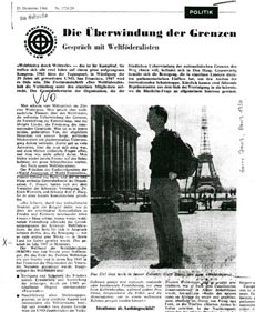 "Die Überwindung der Grenzen" erschienen in Die Weltwoche (Zürich) am 23. Dezember 1966 Das Foto zeigt Garry Davis vor dem Eifelturm in Paris ![]() <-- Info zum Artikel links: November 1940 erschien bei Viking Press das Buch "The City of Man. A Declaration on World Democracy" 1951 veröffentlicht im S.Fischer Verlag unter dem Titel "Ist eine Weltbürgerregierung möglich ?" (Link zum Buch) |