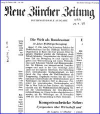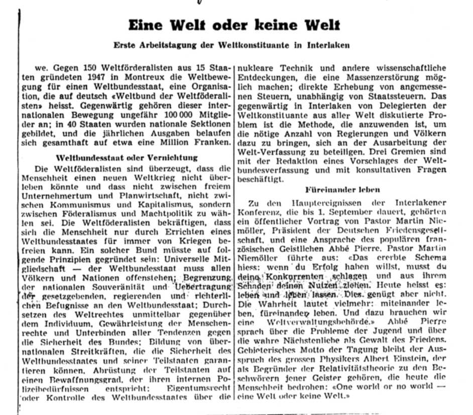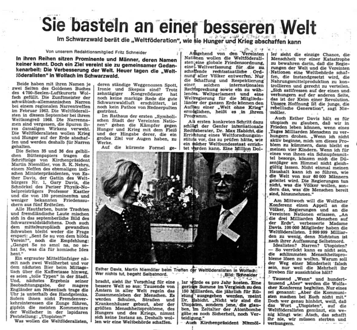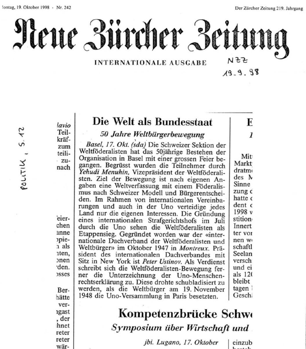 Sie basteln an einer besseren Welterschienen in der Schwarzwälder Zeitung / Bote am 10. September 1968 Das Foto unten zeigt Esther Davis zusammen mit Martin Niemöller, damals Beiratsmitglied der Weltbürger- und Weltföderalisten-Bewegung, sowie Präsident des Evangelischen Kirchentages ![]() "Die Welt als Bundesstaat" erschienen in Neue Züricher Zeitung am 19. September 1998 30 Jahre nach der Weltverfassungs-gebenden Versammlung in Interlaken und 50 Jahre nach der UNO Besetzung. In der Regel finden ca. alle 10 Jahre in der Schweizer Föderation internationale Treffen der Weltbürger und Welt-Föderalisten statt. ![]() |