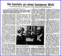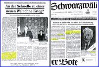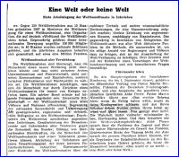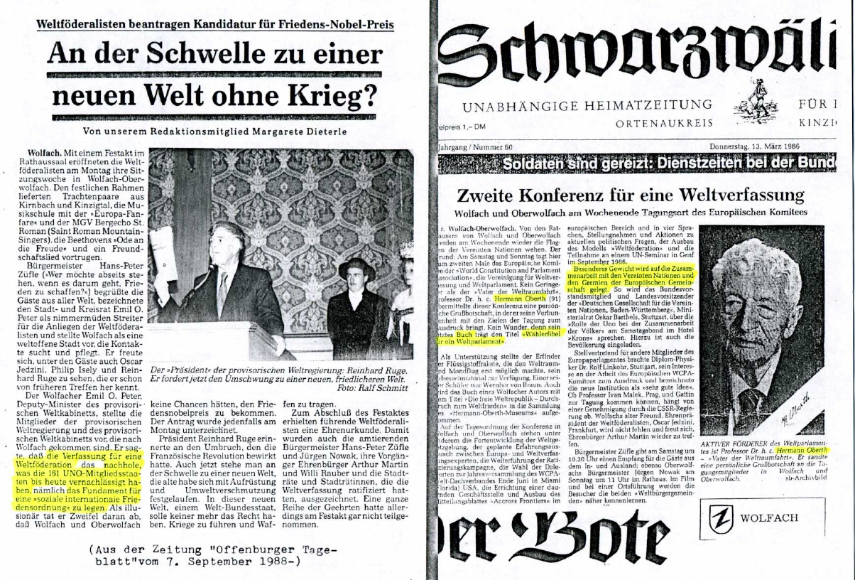 "Eine Welt oder keine" - erschienen im Berner Tagblatt am 31. August 1968 ![]() Unten links: An der Schwelle zu einer neuen Welt ohne Krieg erschienen im Offenburger Tagblatt am 07.September 1988 Sitzung des Weltverfassungs-gebenden Arbeitskomittees der Welt-Föderalisten in den beiden mundialisierenten Gemeinden Wolfach und Oberwolfach mit Unterstützung des Stadt- und Kreisrates. ![]() "Zweite Konferenz für eine Weltverfassung" erschienen im Scharzwälder Boten am 13. März 1986 In Zusammenarbeit mit der Deutschen Gesellschaft für die Vereinten Nationen, Landesverband BW, fand eine Tagung zur Weiterentwicklung des Weltverfassungs-Entwurfes von 1968 in Wolfach statt. Der Vater der Weltraumfahrt in Deutschland, Prof. Hermann Oberth, Autor des Buches "Wählerfibel für ein Weltparlament" sandte zur Eröffnung eine Grußbotschaft. |