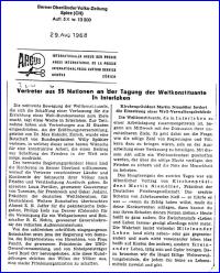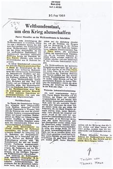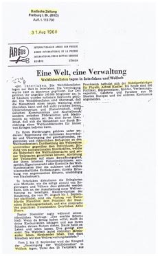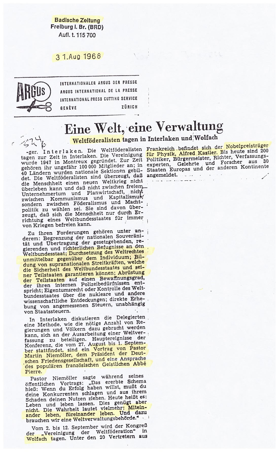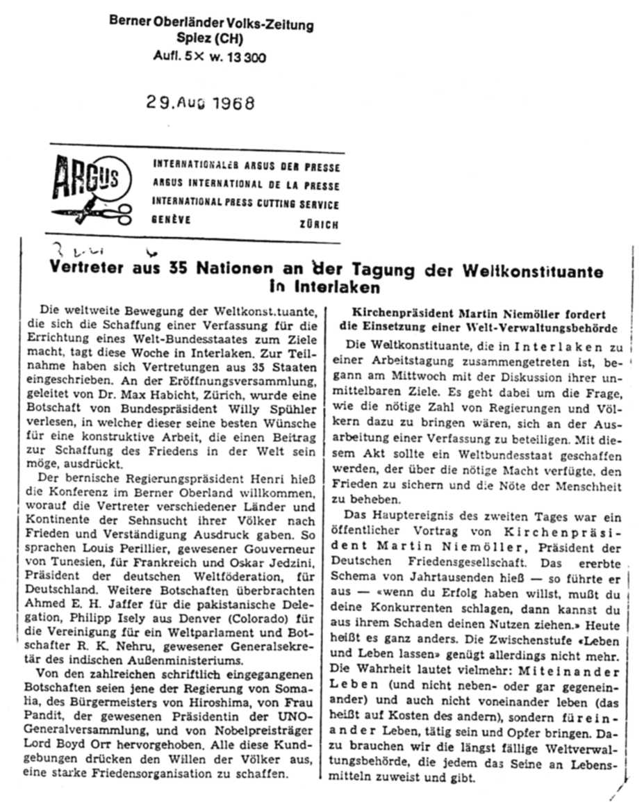 Tagung der Weltföderalisten zur Weltkonstitunante in Interlaken Ende August 1968. Treffen führender Pesönlichkeiten aus der Weltbürgerbewegung zu einer Weltverfassungs-gebenden Versammlung ("Weltkonstituante") in Interlaken, Schweiz, darunter Martin Niemöller, Elisabeth Mann-Borgese (Tochter von Thomas Mann & Autorin des CoR-Berichtes "Die Zukunft der Weltmeere"), Dr. Max Habicht (Jurist aus Genf), R.K. Nehru (Neffe des indischen Ministerpräsidenten und ehem. Generalsekretär des indischen Aussenministeriums) u.v.a. mehr. |