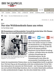 Thomas Mann: Nur eine Weltdemokratie kann uns retten erschienen in Berliner TAGESSPIEGEL am 01.August 2011 Historischer Rückblick auf die Weltbürger- & Weltdemokratie-Bewegung vom Ende der 40er Jahre des 20. Jahrhundert unter Würdigung der Mitwirkung von u.a. Thomas Mann, A. G. Borgese, Lewis Mumford und Hermann Broch. |