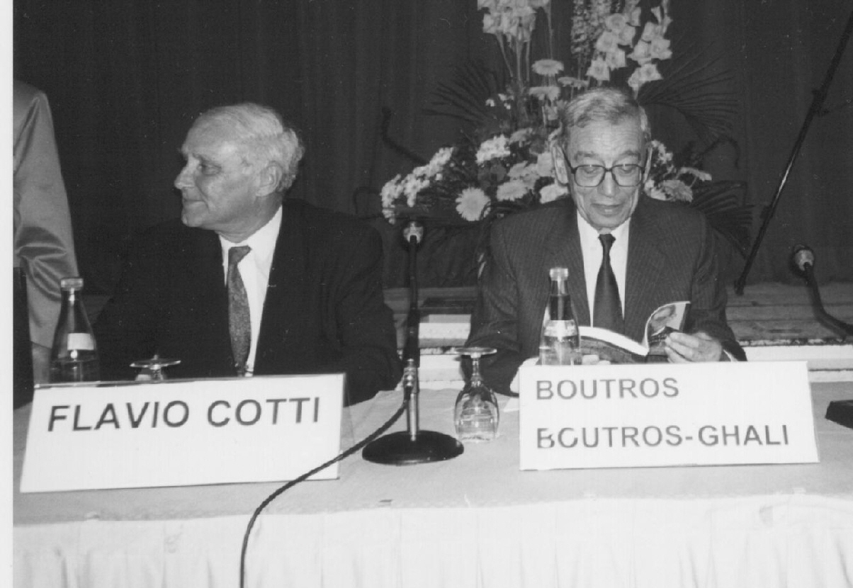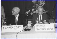 Boutros-Ghali 1993 mit dem neu erschienenen Buch "UNorganisierte Welt", zusammen mit dem damaligen Schweizer Außenminister Flavio Cotti, bei einer Pressekonferenz in Genf. Seit 1992 bestand zwischen dem Herausgeber Stephan Mögle-Stadel als Repräsentant der Weltbürgerbewegung (NGO-Status) und dem Generalsekretariat ein guter informeller Kontakt über Fragen der UNO-Reform und der globalen Regierbarkeit (Global Governance) der Menschheit.