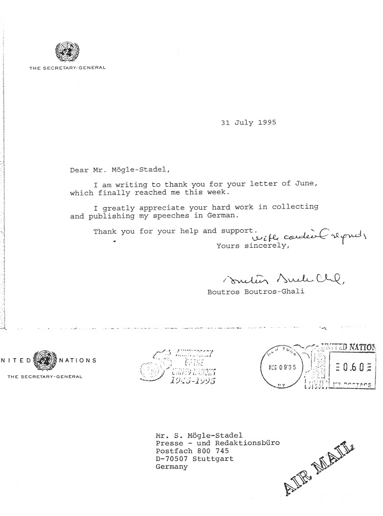 Dankschreiben von Boutros Boutros-Ghali an Stephan Mögle-Stadel zur Buch-Herausgabe.