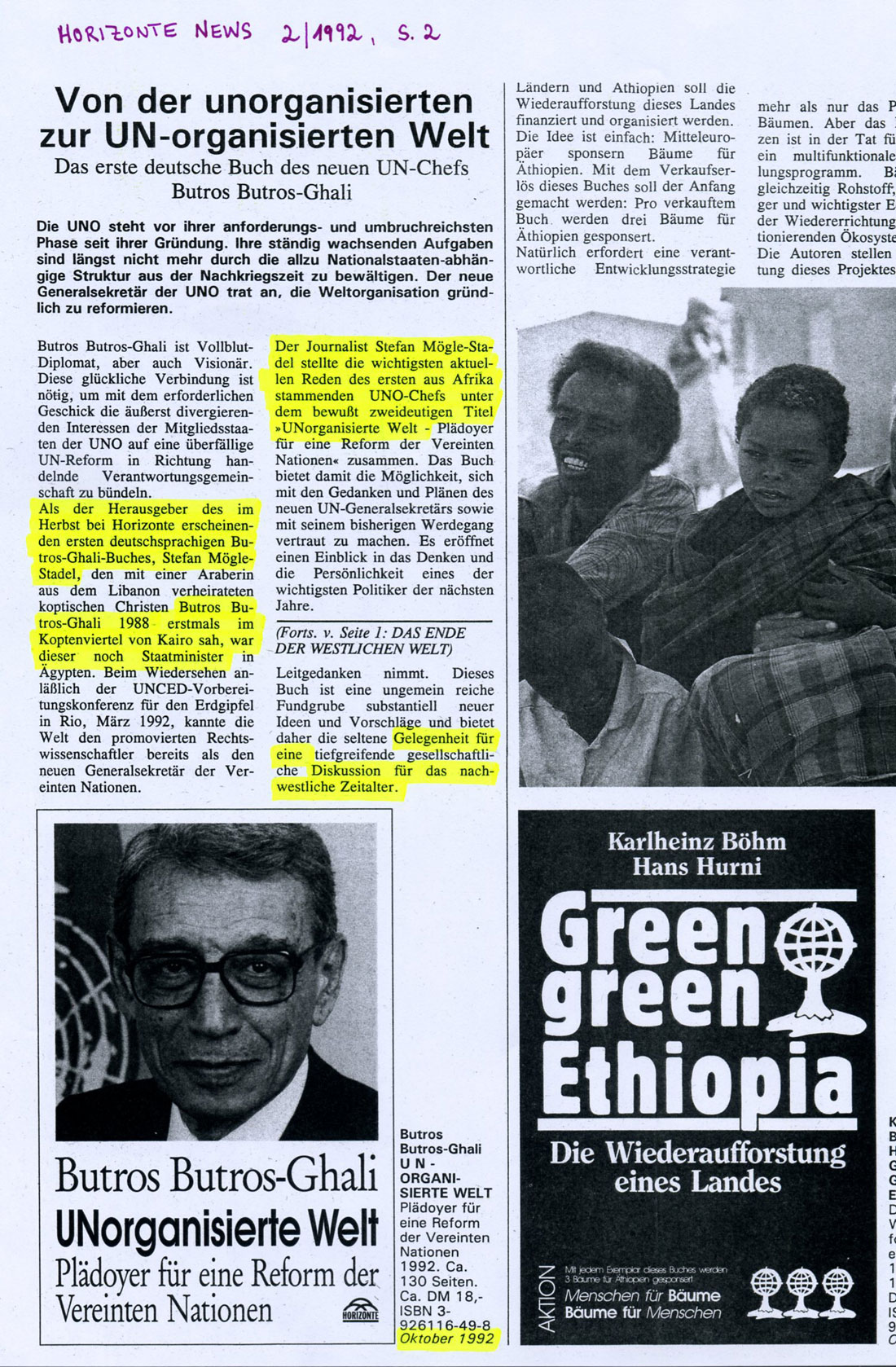 Als der Herausgeber des bei Horizonte erschienenen ersten deutschsprachigen Boutros-Ghali Buches, Stephan Mögle-Stadel, den mit einer Araberin aus dem Libanon verheirateten koptischen Christen Boutros Boutros-Ghali 1988 erstmals im Koptenvirtel von Kairo sah, war dieser noch Staatsminister in Ägypten. Beim Wiedersehen anläßlich der UNCED-Vorbereitungskonferenz für den Erdgipfel in Rio, März 1992, kannte die Welt den promovierten Rechtswissenschaftler bereits als den neuen Generalsekretär der Vereinten Nationen.