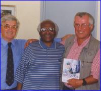 Von Links nach Rechts: Lektor Nick Lee, sowie Friedensnobelpreisträger und Enthüller des Attentats auf Hammarskjöld Erzbischof Desmond Tutu mit dem Übersetzer der englischen Ausgabe Christoph Jensen.