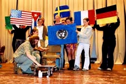 Die als Schatten des Nationalismus Schwarzgekleideten treten zurück, halten nun stumm die Flaggen, während die hell- und buntgekleideten Schüler hervortreten und jeweils ein Ei in eine grosse Bratpfanne schlagen, welche bislang unter der UNO-Flagge in der Bühnenmitte verborgen war. Ein solcher Abschluss, wo die globale Problematik und ihre grundsätzliche Lösbarkeit von den Schülern ins bewegte Theater-Bild gebracht wird, ist eine geglückte Entspannung zu der denkerischen Vorarbeit des Workshops.