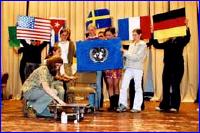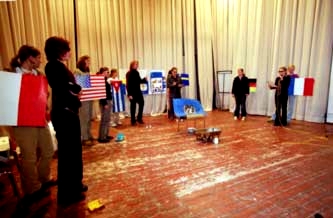 zwei Sprecher mit improvisiertem Text durch das Bühnenstück, ein Junge (J) und ein Mädchen (M). Zu jeder Flagge, im Halbkreis stehend, gehörte eine hellgekleidete und zunächst passive Darstellerin und eine schwarzgekleidete, welche zunächst versuchte einer anderen Nation (Flagge) ein Ei aus deren nationalen Korb zu stehlen.