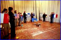 Diskussion und Vorbereitung für die öffentliche Präsentation des Workshopthemas, so wurden z.B. Flaggen verschiedener Nationalitäten gemalt und Rollen verteilt. Sonntags führten