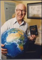 Garry Davis mit GlobusNach seiner Rückkehr aus dem Krieg folgerte Garry Davis 1947, dass die Wurzel des Krieges im Nationalstaat stecke. Inspiriert von Cord Meyers "Peace or Anarchy" and Clarence Streits "Union Now" entdeckte der ehemalige US-Bomberpilot als Alternative zum Krieg der Nationalstaaten eine Weltföderation als völkerrechtliches Mittel zum Weltfrieden. Am 25. Mai 1948 gab Davis im US-Konsulat in Paris seine Staatsbürgerschaft ab, um zu zeigen, dass "die Dominanz des Nationalstaats weder blutig bekämpft noch untertänig befolgt werden muss." Tatsächlich existiere er in Wahrheit nur in der Einbildungen jener, die ihn bekämpften oder verteidigten. "Wenn es mir gelänge, in dieser Welt wenigstens einen zeitlang ohne nationalstaatliche Anerkennung zu überleben, dann hätte ich den Ausschließlichkeitsanspruch des Nationalstaats mitten ins Herz getroffen", meinte Davis. Am 11. September 1948 entdeckte Garry Davis auf der Titelseite der Pariser Ausgabe der International Herald Tribune ein Bild, auf dem der französische UN-Delegierte Robert Schumann dem damaligen UN-Generalsekretär Trygve Lie einen goldenen Schlüssel aushändigt. Das Palais de Chaillot in Paris wurde damit für die Dauer der UN-Generalversammlung symbolisch in die exterritoriale Hoheit der UNO übergeben. Diese Konstellation war wahrlich ein Geschenk der Geschichte, oder - je nach Weltanschauung - des Himmels: Morgen musste der staatenlose Weltbürger laut "refüs de séjour" Frankreich verlassen habe oder Gefahr laufen, interniert zu werden.