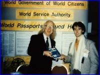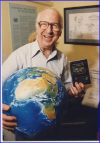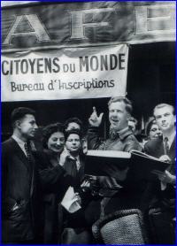 Garry Davis mit GlobusNach seiner Rückkehr aus dem Krieg folgerte Garry Davis 1947, dass die Wurzel des Krieges im Nationalstaat stecke. Inspiriert von Cord Meyers "Peace or Anarchy" and Clarence Streits "Union Now" entdeckte der ehemalige US-Bomberpilot als Alternative zum Krieg der Nationalstaaten eine Weltföderation als völkerrechtliches Mittel zum Weltfrieden. Am 25. Mai 1948 gab Davis im US-Konsulat in Paris seine Staatsbürgerschaft ab, um zu zeigen, dass "die Dominanz des Nationalstaats weder blutig bekämpft noch untertänig befolgt werden muss." Tatsächlich existiere er in Wahrheit nur in der Einbildungen jener, die ihn bekämpften oder verteidigten. "Wenn es mir gelänge, in dieser Welt wenigstens einen zeitlang ohne nationalstaatliche Anerkennung zu überleben, dann hätte ich den Ausschließlichkeitsanspruch des Nationalstaats mitten ins Herz getroffen", meinte Davis.